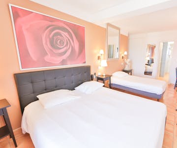 Pensée pour accueillir jusqu’à trois personnes sans compromis sur l’espace ou le confort, notre Chambre Triple Privilège est idéale pour les petites familles, les amis ou les voyageurs souhaitant plus d’autonomie. Elle combine une literie haut de gamme et une ambiance douce et apaisante, à seulement quelques pas de la plage. Dotée d’un grand lit double et d’un lit simple, cette chambre de belle superficie vous permet de partager votre séjour à Marseille tout en conservant votre espace personnel.